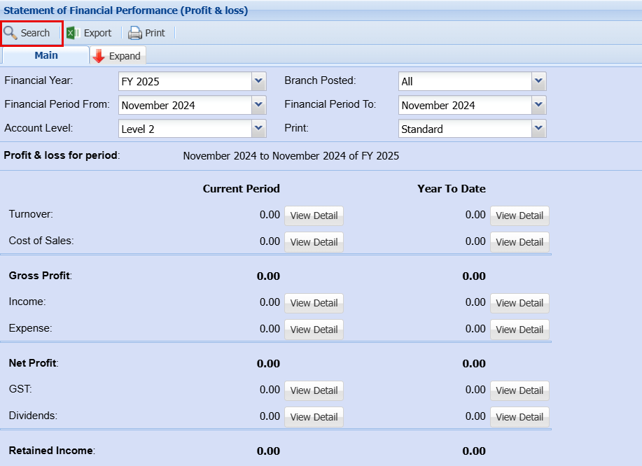 Log into the General Ledger Module > Reports > Financial Performance (Profit and Loss)