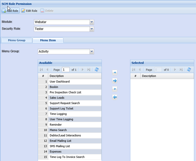 We will be giving access on the activity menu group by moving the menu we want to the right box (selected)