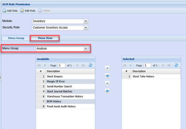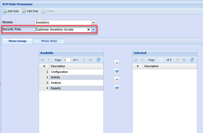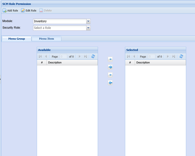 After clicking OK, Select the new Role created. We have to first setup the menu groups under that module and then the menu Items to be viewed by that role. Select the Menu Group which you want the user to see.