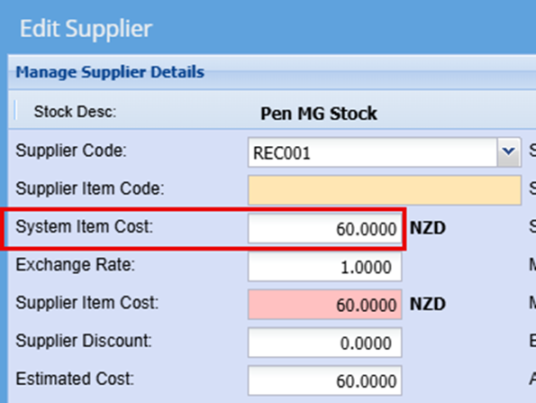 In the System Item Block Add the cost of this item from this supplier and click Save