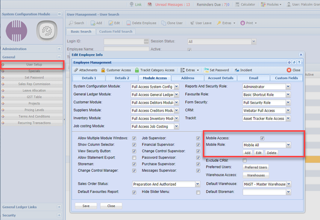 System Configuration Module > General > User Setup > Edit User > Module Access tab