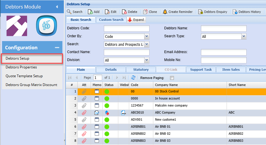 Debtors / Customers setup