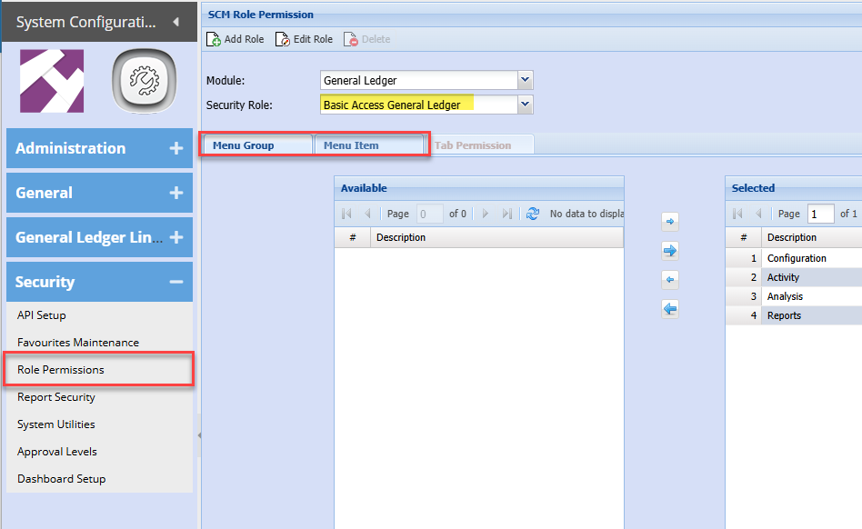 Setup role permissions per user to show or hide access to menu groups and menu items