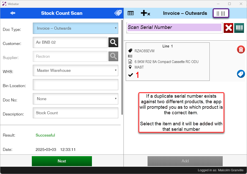 The app will display a prompt if it finds more than one product for the scanned serial number.