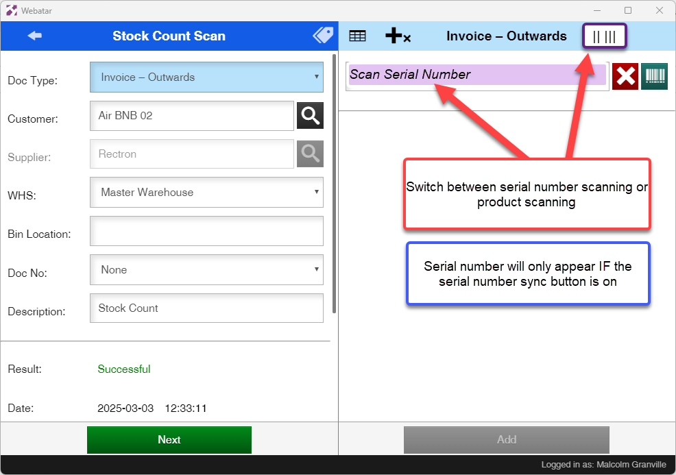 Serial numbers scanning button switch is only available if the Serial number sync button is active.active. When active the synced Serial Numbers will be searched if the scanned text does not match the barcodes or stock codes of any synced Stock ItemsItems.