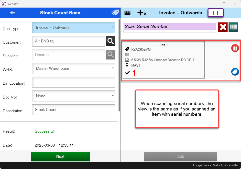 Serial number scanning does not work with outwards which includes, Stock Receive, Stock Adjustment and Credit Note documents.