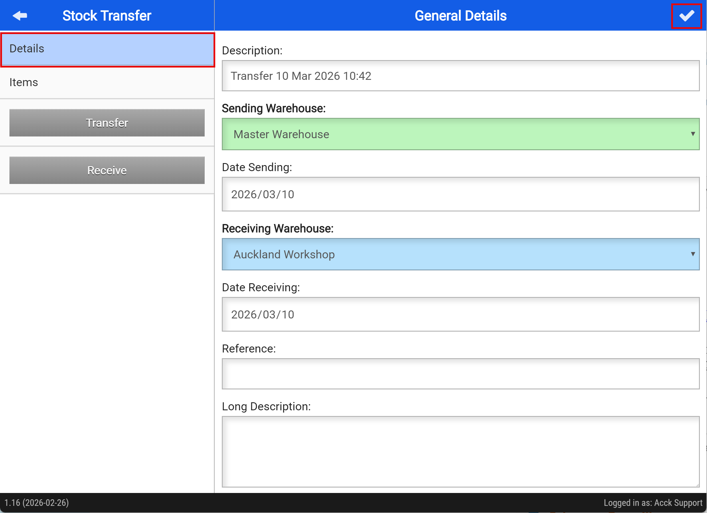 Once the stock arrives at the receiving warehouse, they can confirm the delivery by clicking the “Receive” button.